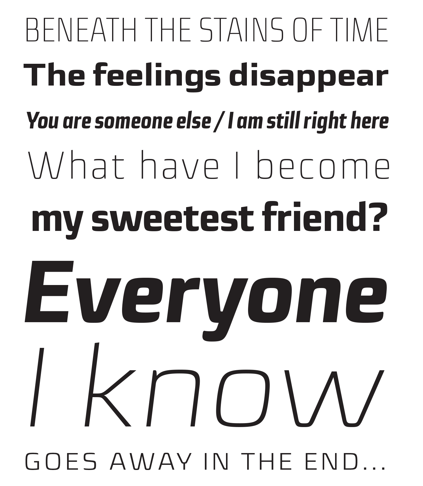 The Sica Family was designed in order to address issues related to technology, while maintaining humanistic forms. Thus, a font with square shapes emerged, but with smooth curves and slightly rounded terminals making it friendly. The family has three widths – condensed, normal and expanded – each of them with six weights and their respective italics, resulting in 36 fonts. With particular details and open shapes that increase legibility, it can be used for both text compositions as well for display sizes. It has 774 glyphs, covering more than 50 languages, as well as ligatures, lining, oldstyle, tabular and proportional figures, fractions, superiors, inferiors, and small caps, all of them accessible through OpenType features.